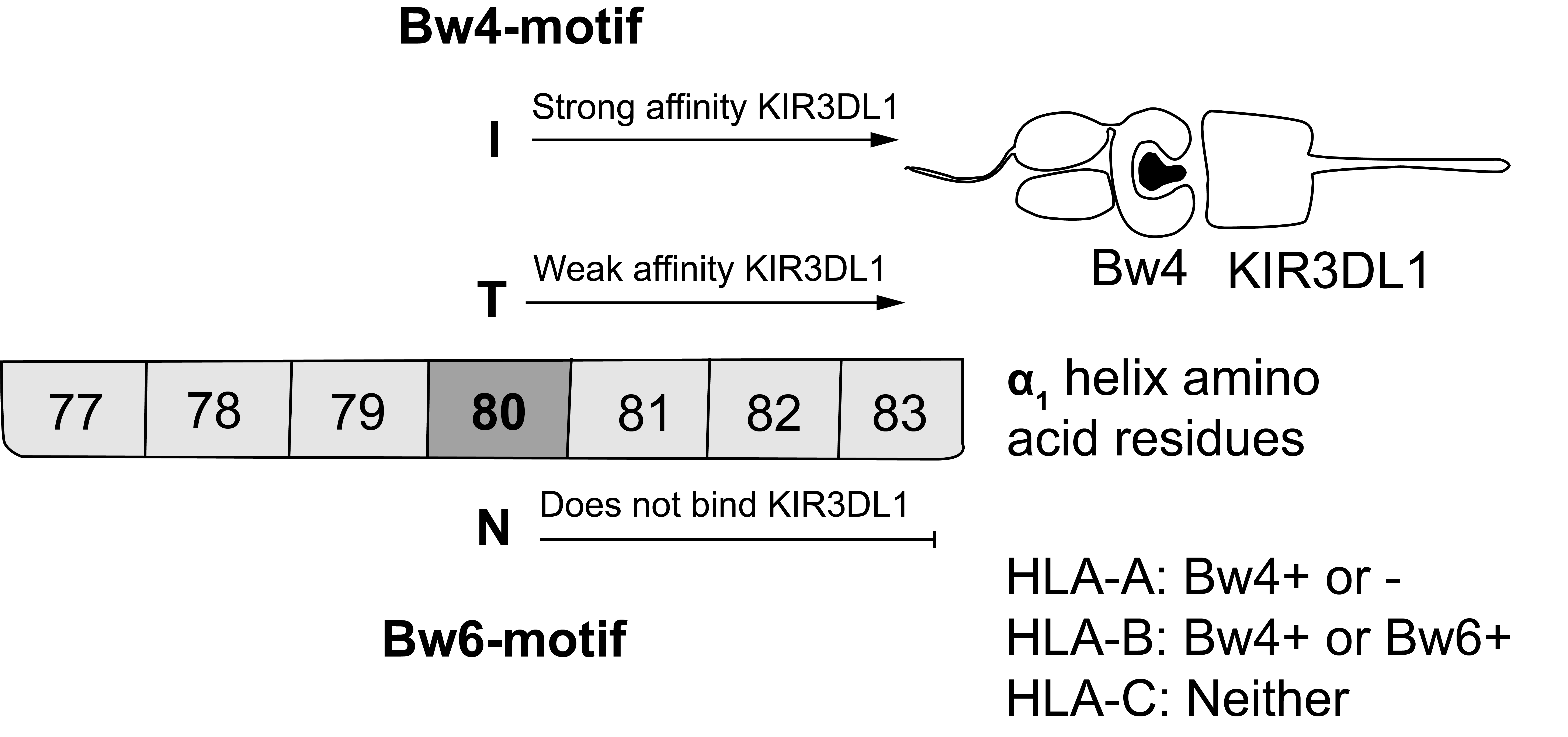 Importantly, there are two Bw4-allotypes defined the amino acid at position 80, either an isoleucine (Bw4-80I) or threonine (Bw4-80T). Bw4-80I is a high affinity for KIR3DL1 whereas Bw4-80T is lower affinity. The higher affinity of Bw4-80I leads to more strongly educated and reactive NK cell populations compared to the lower affinity Bw4-80T. The Bw6-motif does not bind to KIR3DL1.
