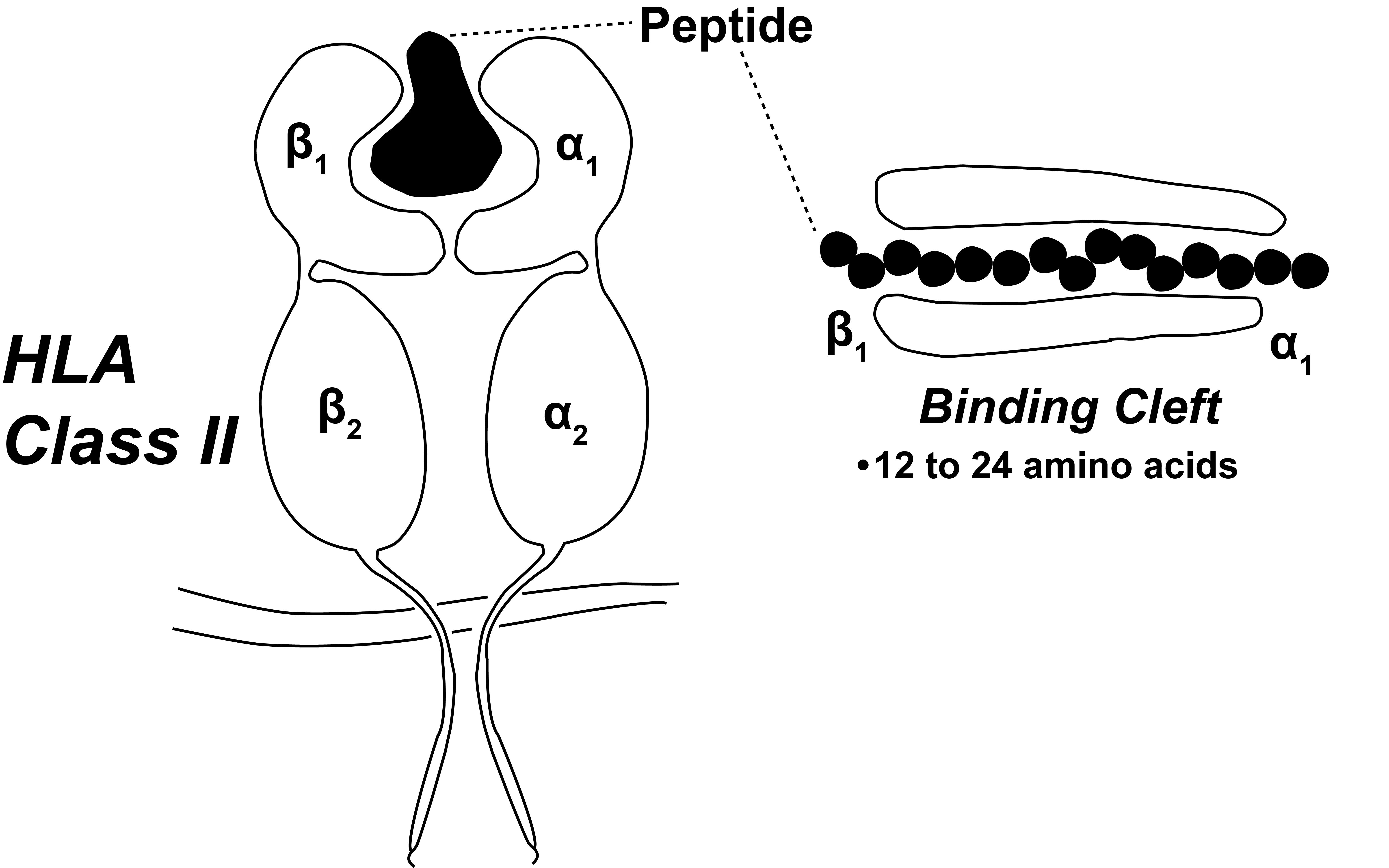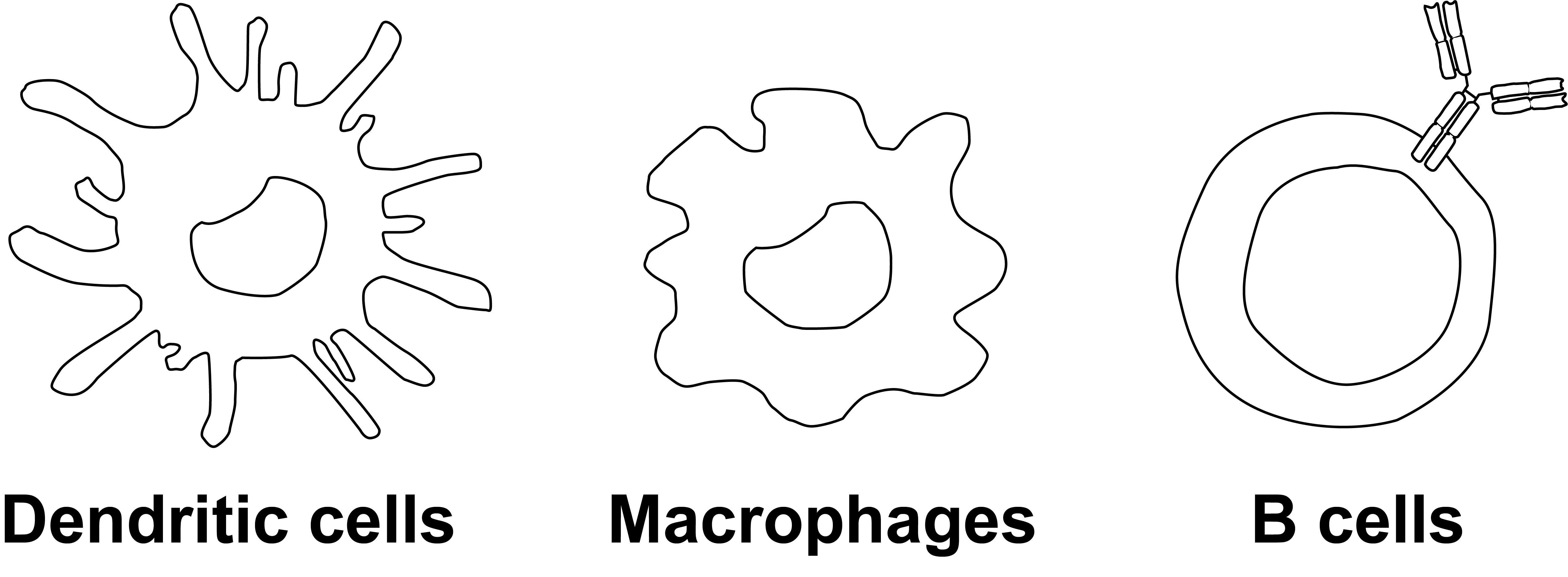 HLA class II molecules are expressed by professional antigen-presenting cells (APC)–dendritic cells, macrophages, and B cells.