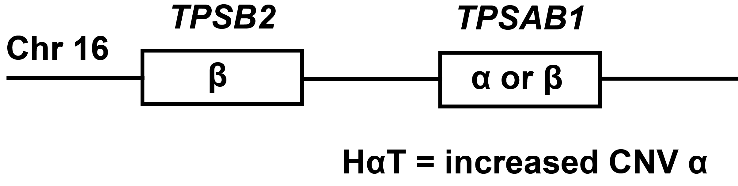 TPSAB1 increased: HaT, SM CNV (alpha tryptase) alpha or beta tryptase constitutively released (measure of MC burden)