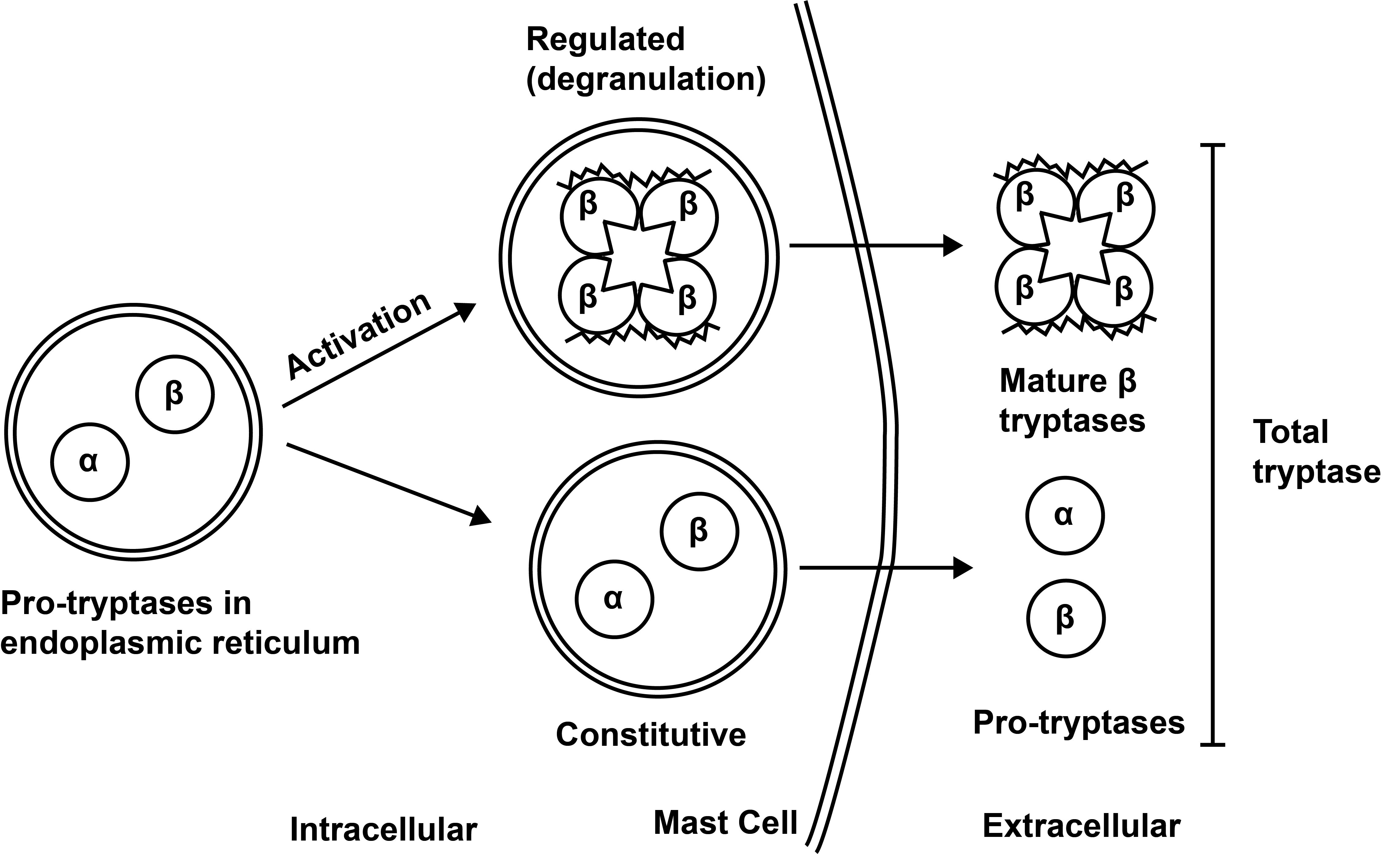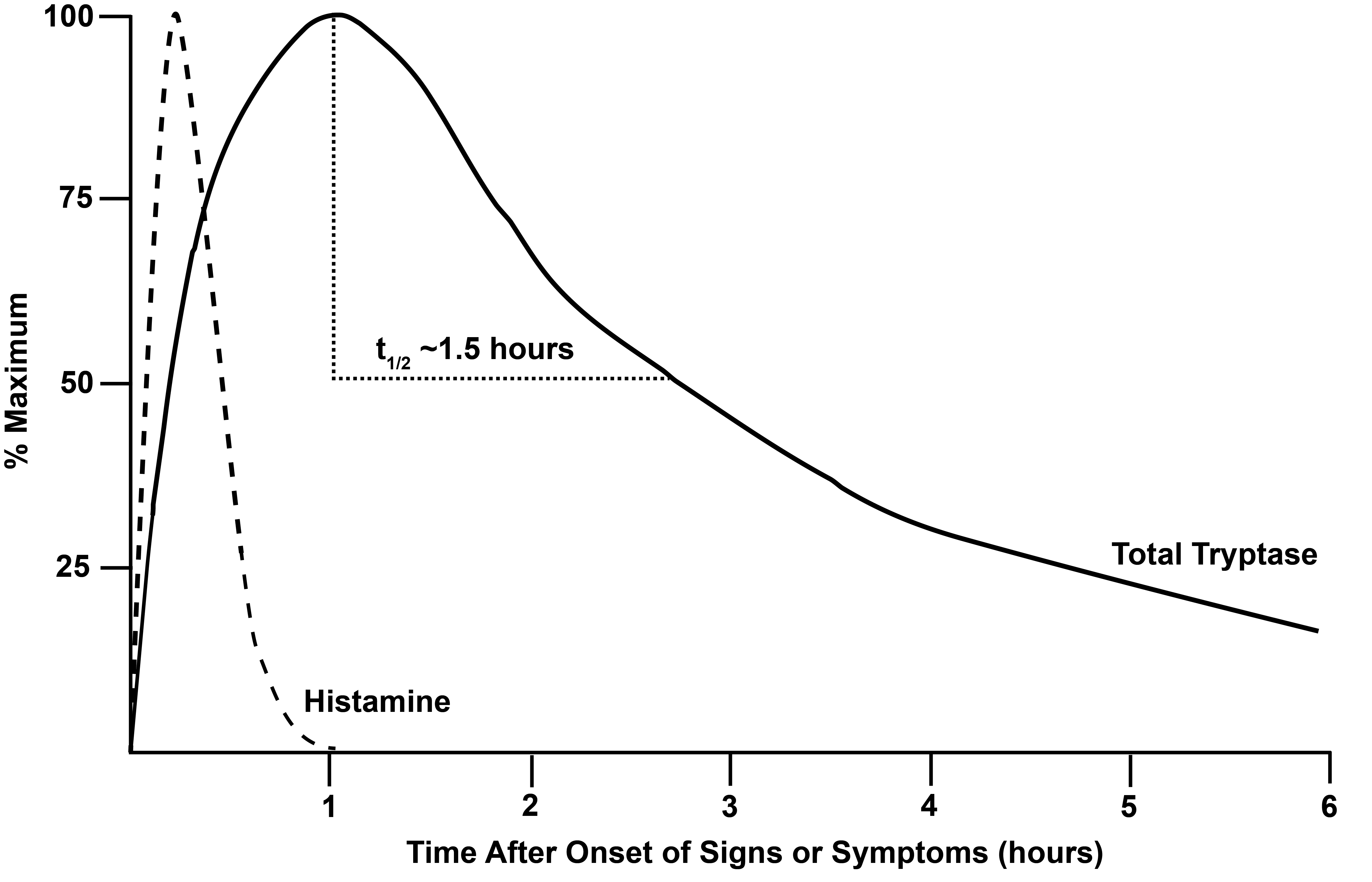 Total Tryptase = a + B by ImmunoCAP (R) In vitro assay half-life ~90 minutes peak at 1 hr stored primarily in MC