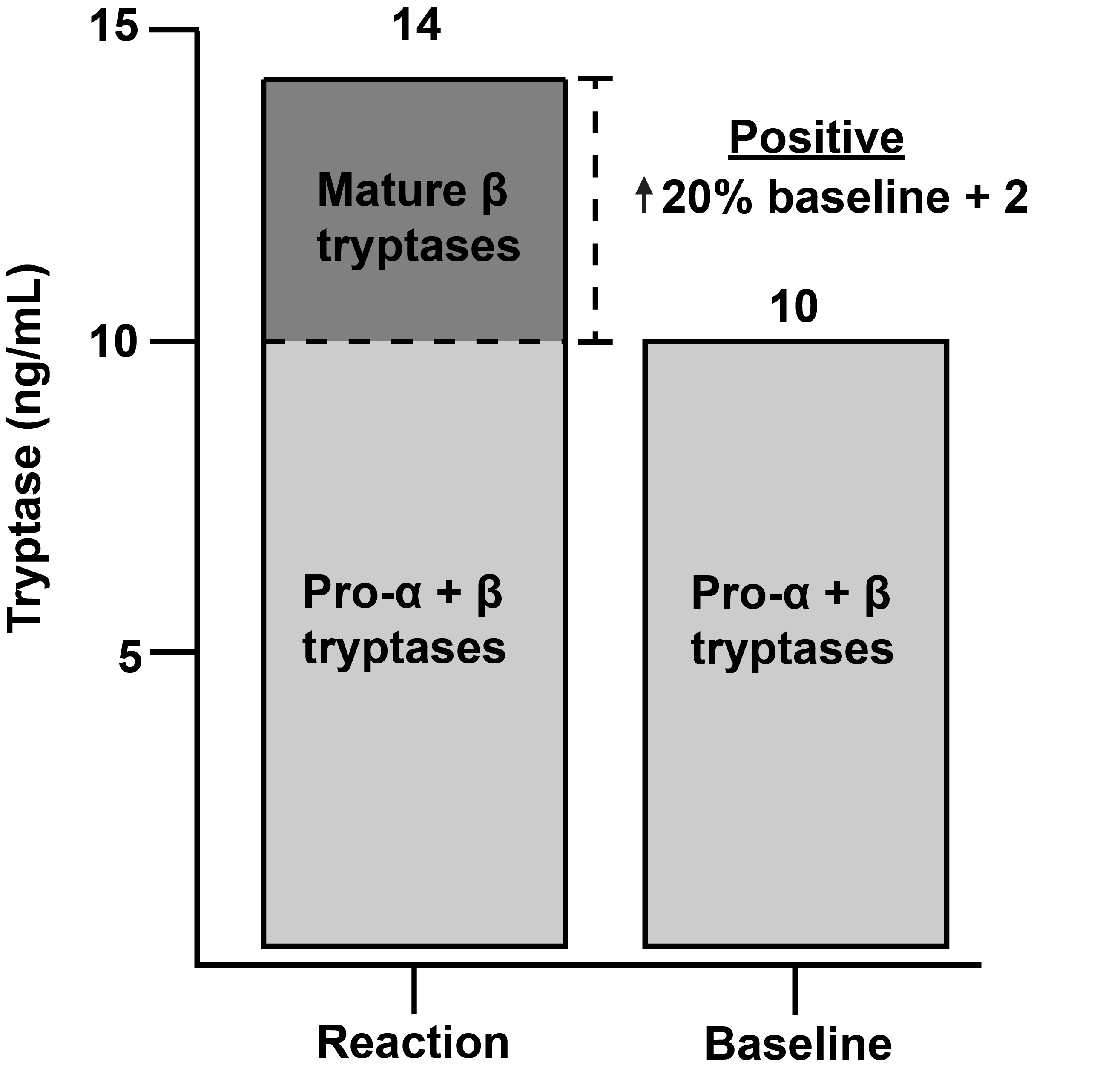 Elevated basal tryptase >= 11.5 ng/mL Can get basal tryptase at 24 hrs after anaphylaxis event